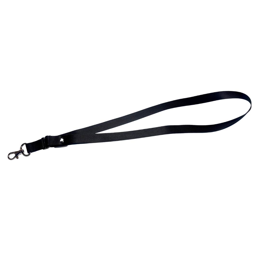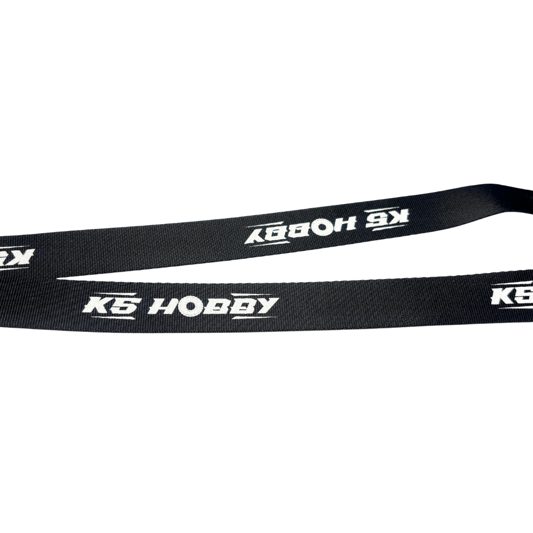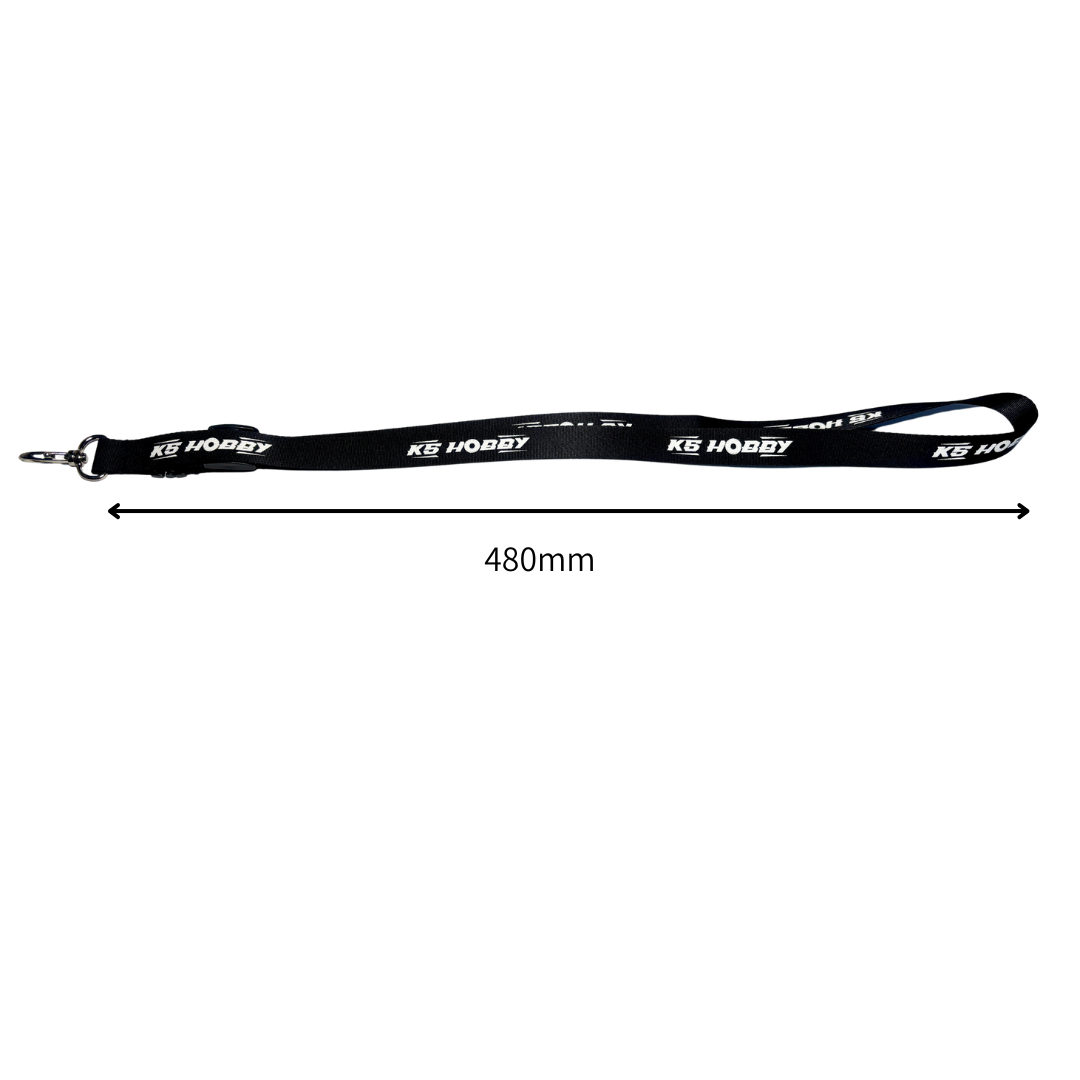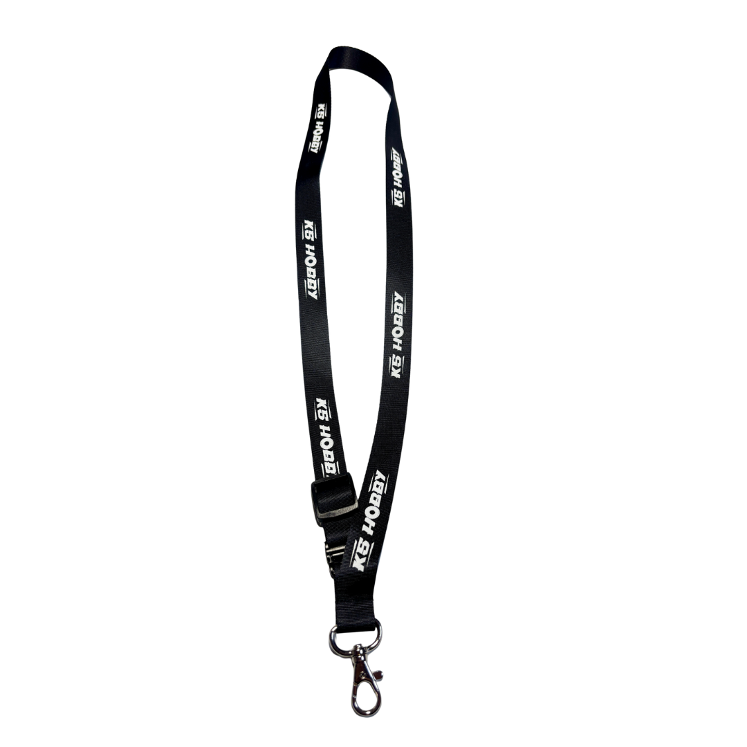 KS HOBBYのロゴ入りネックストラップです。ブラックベースにホワイト切り抜きのシンプルなデザインでナスカンタイプの金具付きです。紐の長さを調整するパーツがついています。クローラーなら足場が悪い所で操作するのでもしもの時はプロポから手を離してもプロポを落とさなく安心です。